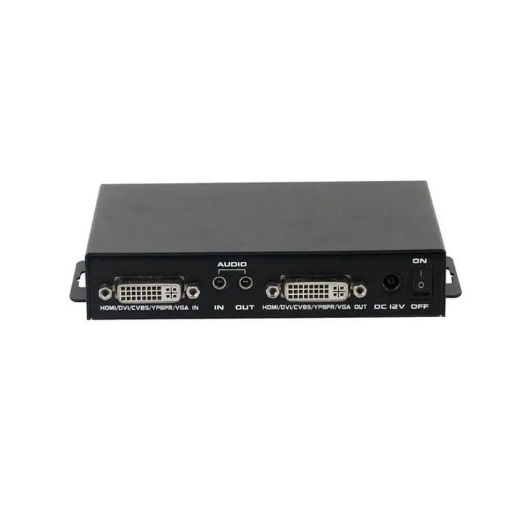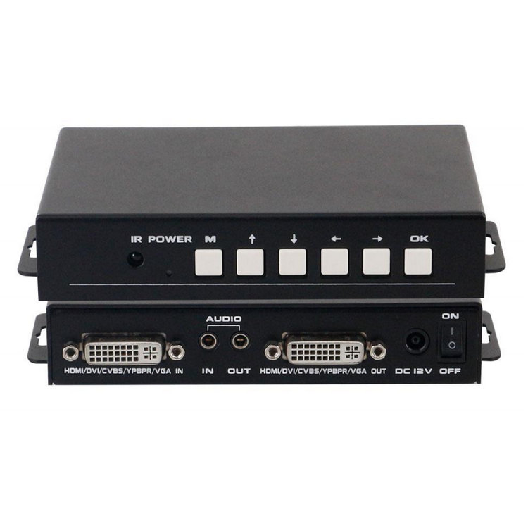 PRODUCT CENTERMK-MAV-MAV是一款功能強(qiáng)大的多格式信號轉(zhuǎn)換器支持任意高清、標(biāo)清、模擬和數(shù)字信號的相互轉(zhuǎn)換功能,配合對應(yīng)的轉(zhuǎn)換頭可支持CVBS/DVI/VGA/Ypbpr/HDMI信號之間的相互轉(zhuǎn)換。信號輸入輸出均采用DVI-I接口,模擬音頻采用3.5mm音頻接口輸入輸出。此轉(zhuǎn)換器采用了信號轉(zhuǎn)換技術(shù),支持去隔行技術(shù),支持3D降噪,支持視音頻的同步切換,支持即插即用功能,不需任何操作,支持輸入輸出的信號檢測,支持各種輸入接口對應(yīng)格式分辨率,支持圖像的縮放,支持色彩、亮度、對比度、銳度等圖像調(diào)節(jié),支持圖像鏡像等多種功能。